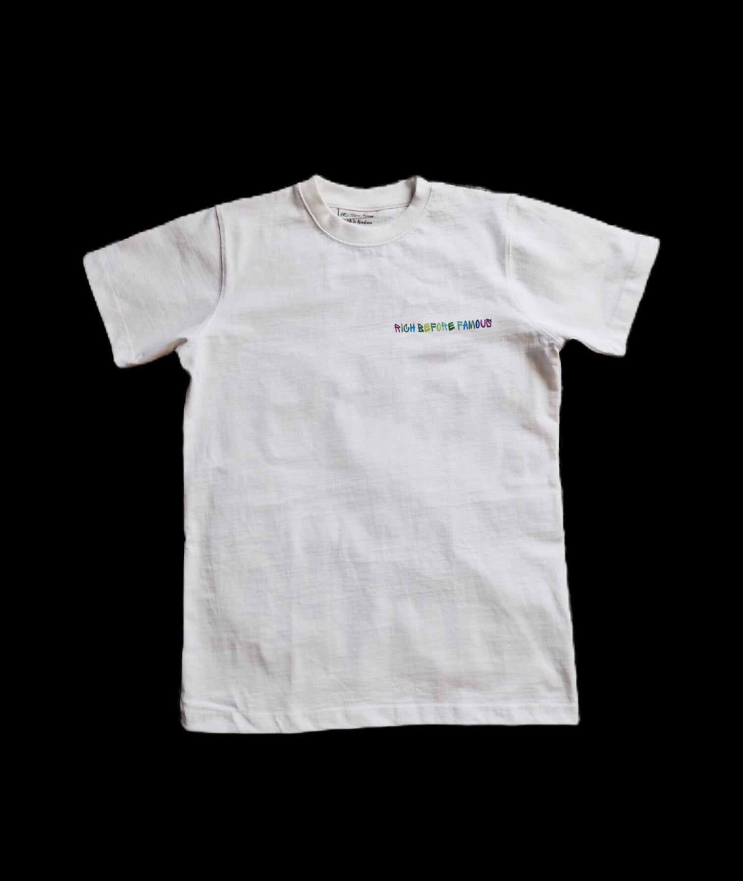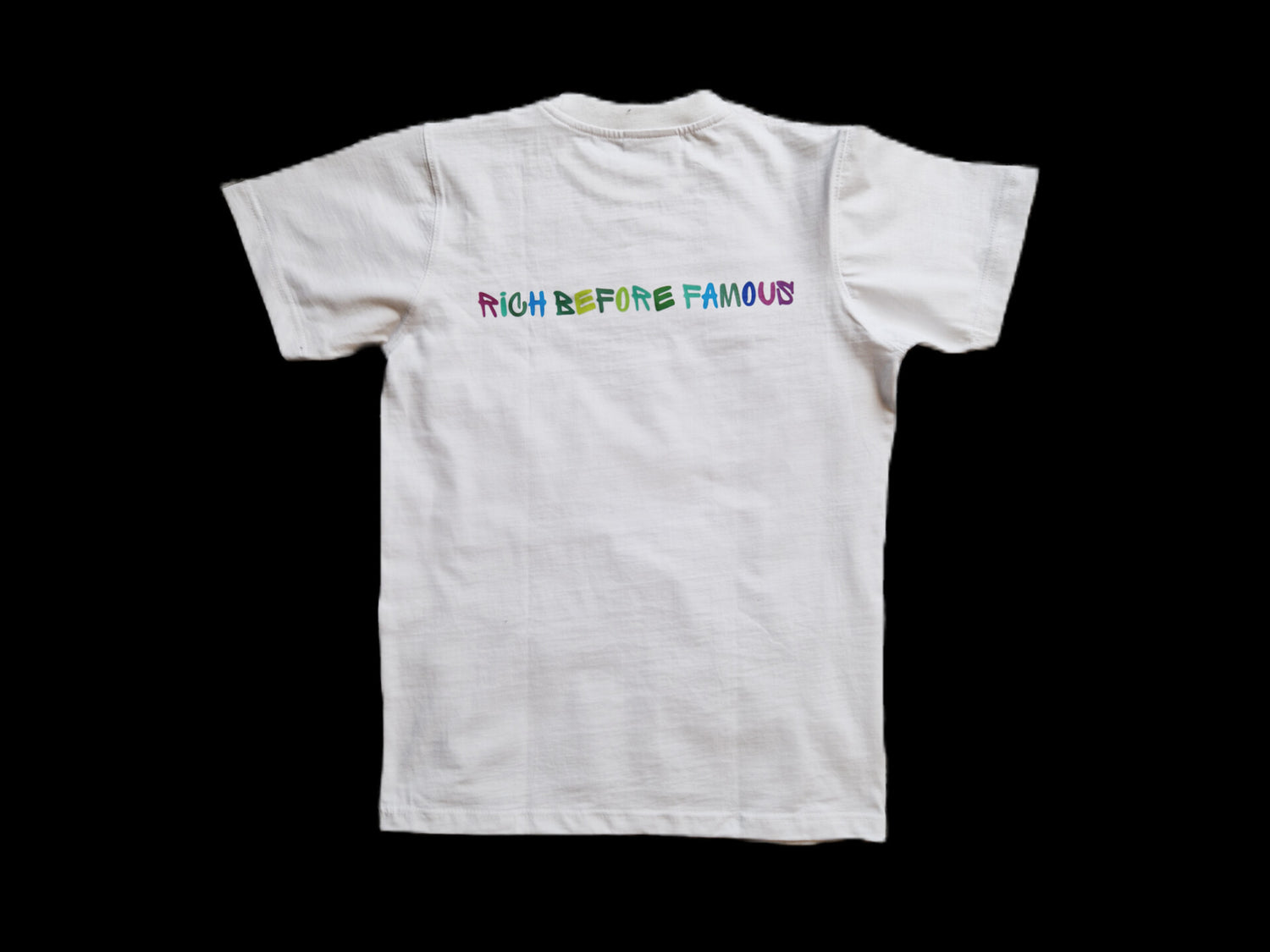 Part of our Summer Splash Collection, this white organic cotton T-shirt brings bold energy and clean comfort. Featuring "Rich Before Famous" printed in vibrant blue, purple, and green on the left chest and across the centre back, the unique lettering adds a colourful statement.