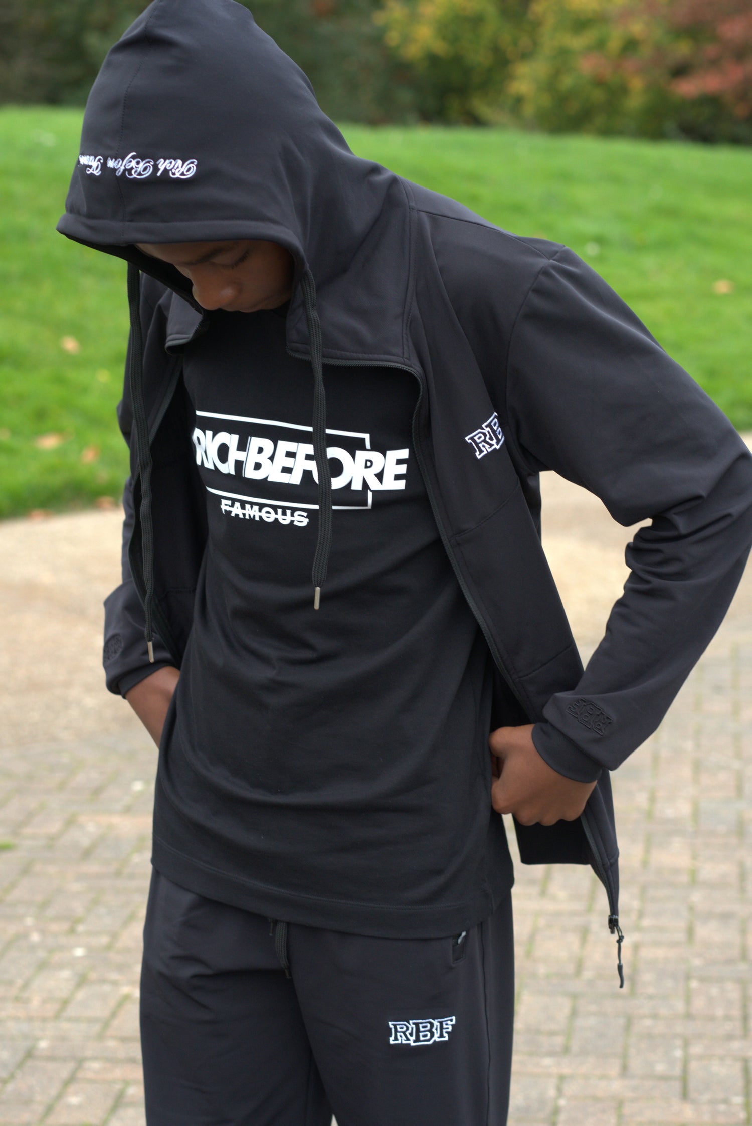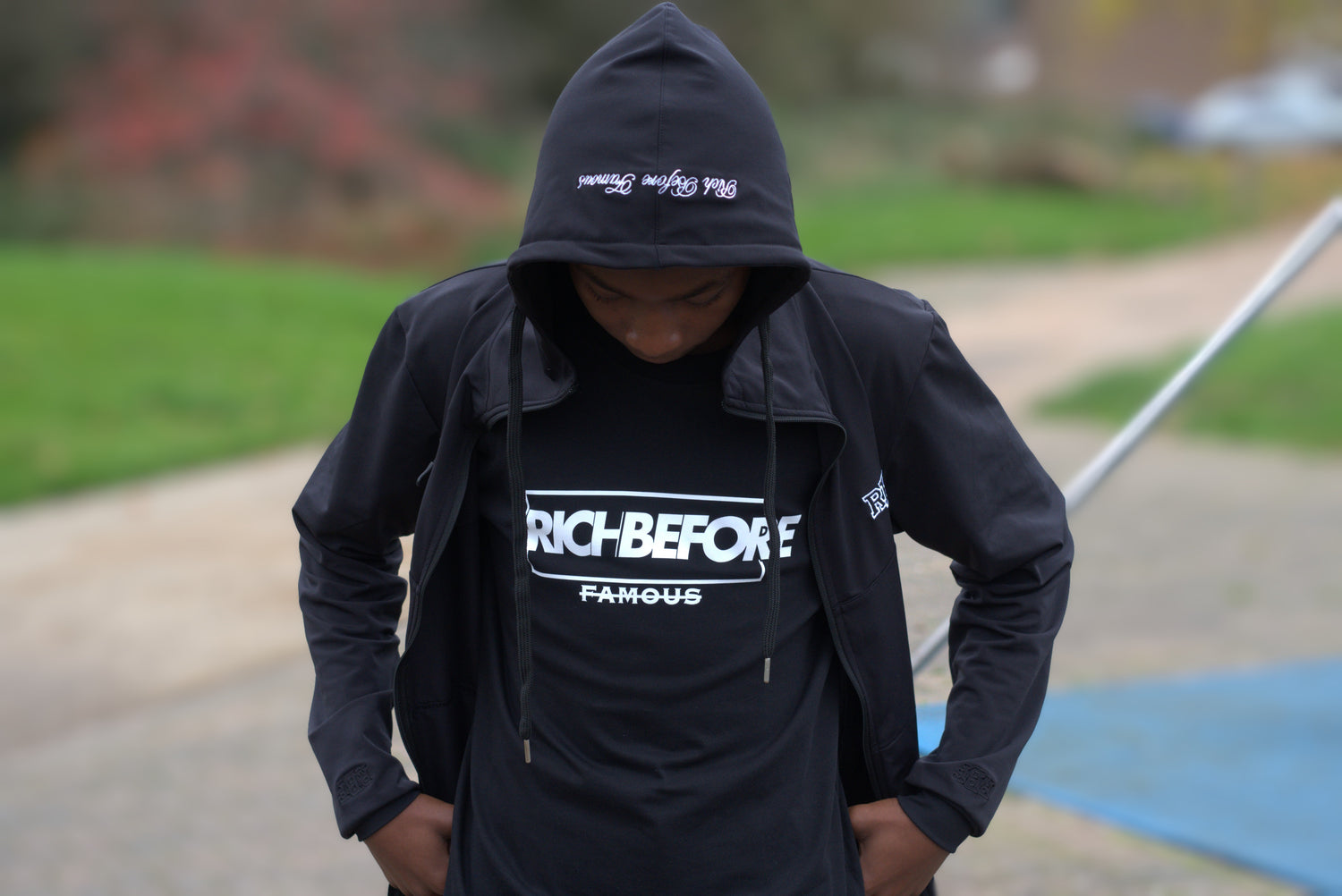 Rich before famous organic cotton tshirt in black with the vintage Rich Before Famous stamp in a rectangular frame